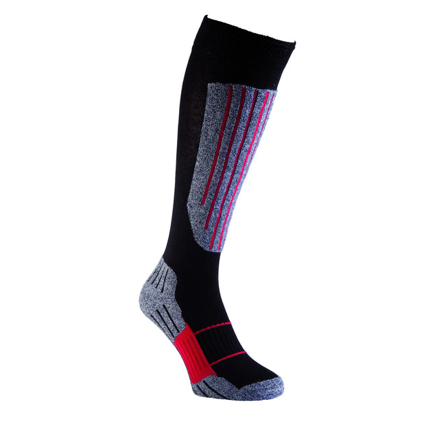 Kniehohe Wärmesocke die besonders an kühlen Tagen angenehm warm und trocken hält. Die THERMOLITE®-Hohlfasern bieten Wärme und Komfort ohne Gewicht. Durch die dehnbaren Ripstrickeinsätze im Mittelfußbereich und den festen Elastikabschluss passt sich die Socke wie eine zweite Haut an Fuß und Bein an. Druckmindernde Polsterzonen bieten bestmöglichen Schutz vor Blasen und Druckstellen. Sportliche Akzente setzt die Farbkombination schwarz-grau mit roten Kontrasteinsätzen.