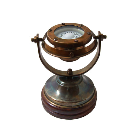 Kompass kardanische Aufhängung auf Holzsockel antik, Navigation, Höhe 14 cm