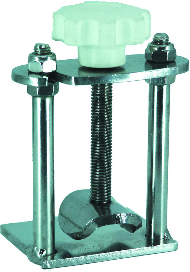 Dieser Ankerschafthalter (D) fixiert auch bei extremem Seeschlag jeden Anker. Die Feststell-Schraube braucht nur 3 mm gelöst werden, um den Anker freizugeben. Der Halter klappt vollständig auseinander, weder Schäkel noch Kette können sich verhaken. Aus Edelstahl gefertigt. Die Maße der Bodenplatte betragen 68x55 mm.