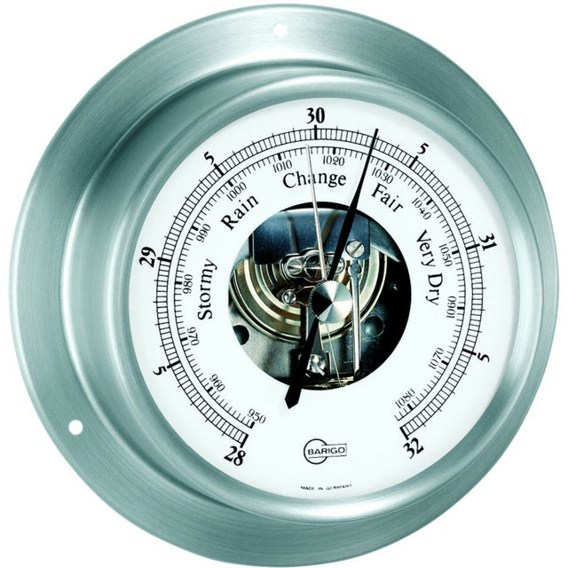 Das BARIGO Tempo Barometer ist aus gebürstetem Edelstahl gefertigt. Durch seine matte Gehäuseoberfläche wirkt es formschön und edel. Wie alle Schiffsuhren von BARIGO, so hat auch dieses BARIGO Tempo Barometer aus Edelstahl ein Quarzuhrwerk. Das Zifferblatt ist weiß und die Skala des Barometers trägt schwarze Ziffern.