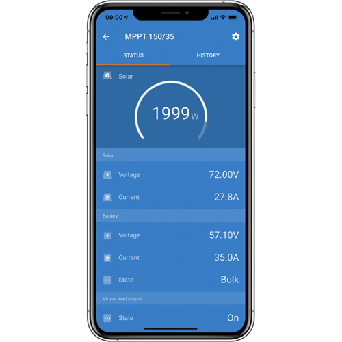 Steuern und überwachen Sie die umfangreichen Funktionen Ihres SmartSolar MPPT-Ladegeräts mit integriertem Bluetooth fern, indem Sie es über VictronConnect mit Ihrem Smartphone oder einem anderen Gerät koppeln. Wenn Ihre Installation mit einem GX-Gerät mit dem Internet verbunden ist, bietet das Victron Remote Management Portal jederzeit und überall Zugriff auf die volle Leistung Ihres MPPT. Sowohl VictronConnect als auch VRM können kostenlos verwendet werden. Bei entfernten Installationen – selbst wenn keine Internetverbindung in der Nähe ist – können Sie Ihren MPPT möglicherweise überwachen, indem Sie den GlobalLink 520 anschließen.