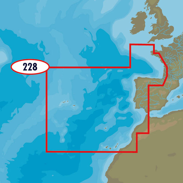 C-MAP 4D MAX+ EW-D228 West European Coasts deckt den südwestlichen Bereich des europäischen Atlantiks bis einschließlich nordwestliches Afrika ab.
