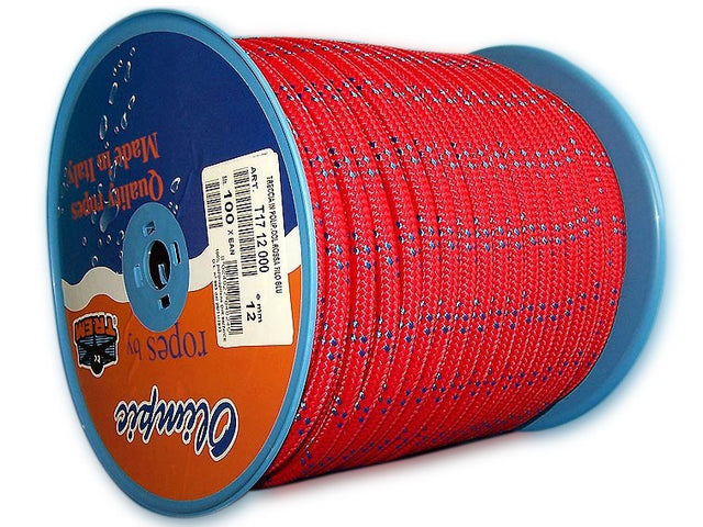 Polypropylenleine 2 Meter, 8 mm Durchmesser, schwimmfähig, rot mit blauem Kennfaden, hohe Zugfestigkeit, UV- und verrottungsbeständig, chemische Widerstandsfähigkeit