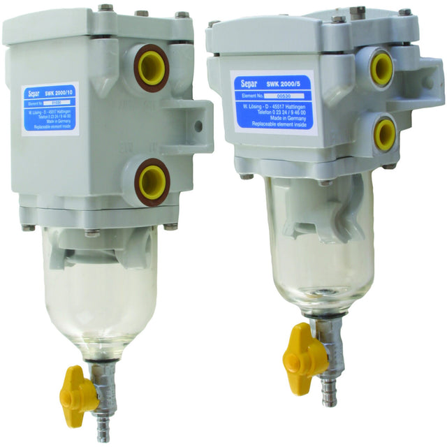 Der SEPAR 2000 Dieselfilter ist dank des vollkommen neuen, mehrfachen Zentrifugal-System die perfekte Lösung von Wasser- und Schmutzproblemen an Bord. Er ist Wasserabscheider und Diesel-Filter zugleich für leichte Dieselkraftstoffe. Durch den Rückspülprozess verlängert sich die Lebensdauer des Filterelementes.