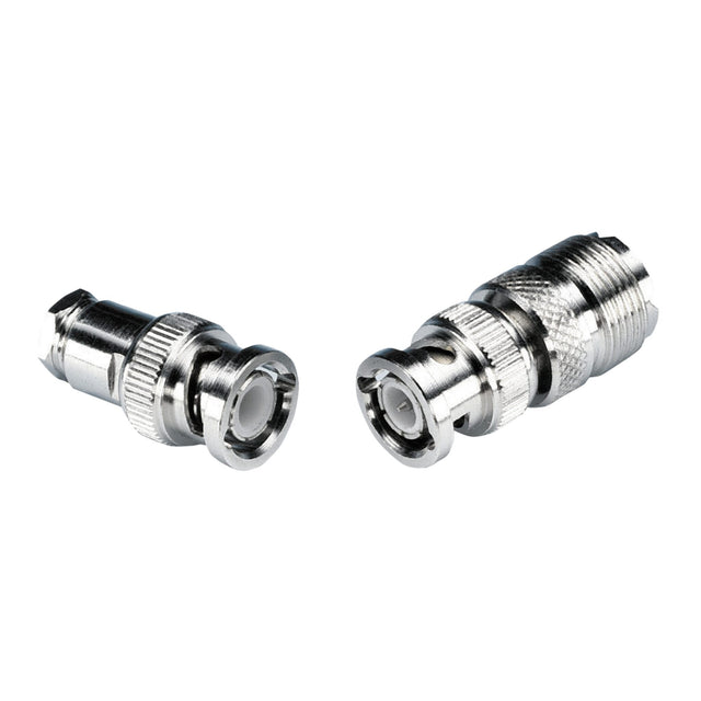 Adapter für BNC-Stecker/PL-Buchse aus vernickeltem Messing. Länge 34 mm, Durchmesser 15 mm.