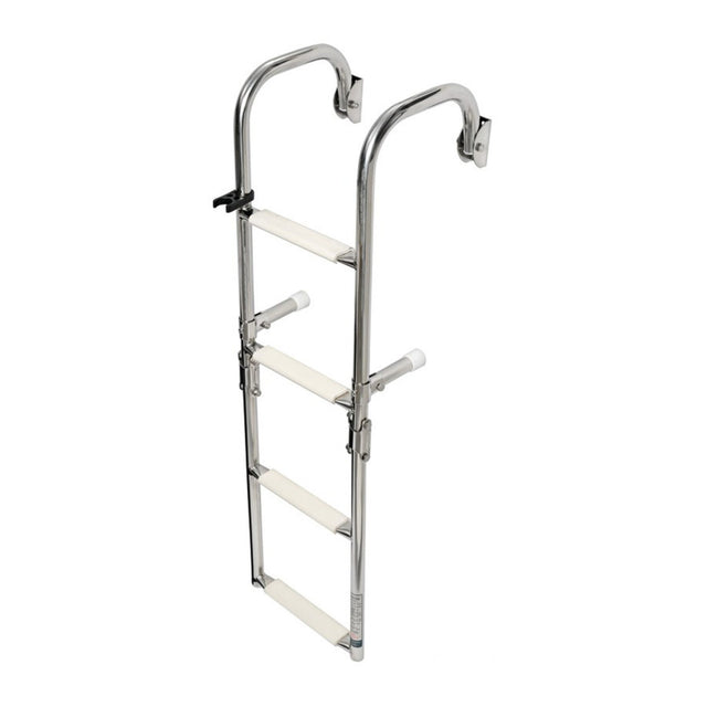 Die Badeleiter mit Handlauf-Bügel verfügt über einen übergreifenden Bügel zur Montage an Deck. Dieser Bügel ermöglicht ein bequemes Aufsteigen und sicheren Halt beim an Bord gehen. Die Badeleiter ist aus Edelstahl gefertigt und mit vier Stufen versehen. Die Stufen der Leiter sind für mehr Komfort abgeflacht und mit einer rutschfesten Kunststoffauflage ausgestattet. Die Badeleiter hat eine Gesamtlänge von 91 cm und eine Breite von 26 cm.