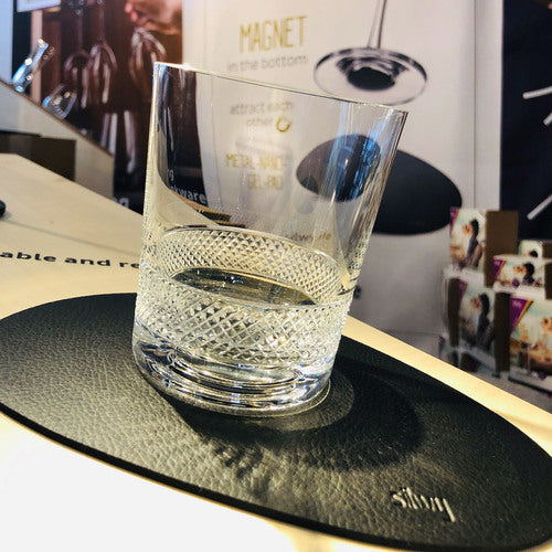 Der Magnetboden eines silwy Glases haftet im genau richtig abgestimmten Kraftverhältnis auf den metallischen Gel-Nano-Platzset.