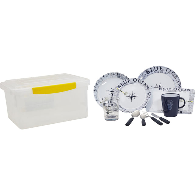 Machen Sie sich das Leben beim Campen, an Bord oder beim Picknick einfacher mit dem rutschfesten Geschirrset von Brunner. Alles, was Sie für 4 Personen benötigen, wird in einer Transportbox geliefert. Alle Geschirrbestandteile sind in Weiß mit einer hellblauen Umrandung und dem Aufdruck "Blue Ocean" versehen.