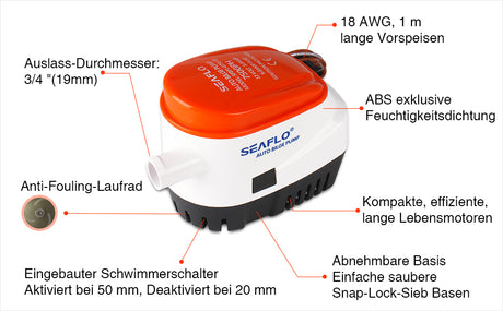 SEAFLO Bilgepumpe 12V 4164L/h, Lenzpumpe, robust und kraftstofffest