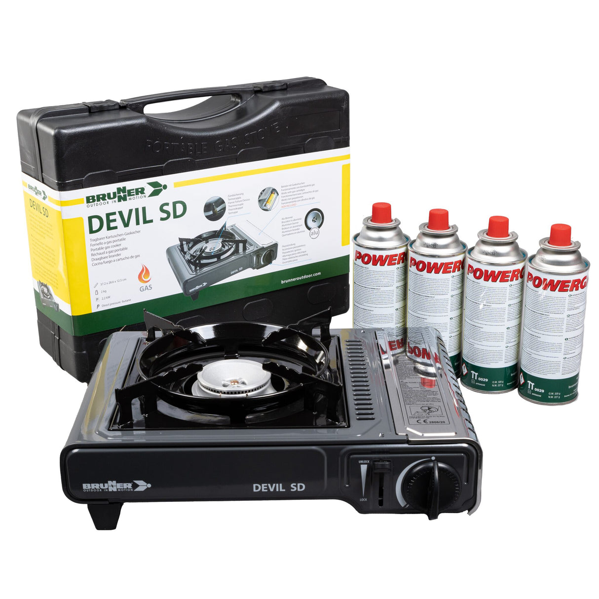 Brunner Gaskocher DEVIL SD, Campingkocher mit Zündsicherung, tragbarer Gaskocher für Reisen und Outdoor-Aktivitäten - (Optional mit 4 Gas-Kartuschen) - inkl. 4 Gas-Kartuschen ist auf Lager und wird versandt, sobald es wieder verfügbar ist