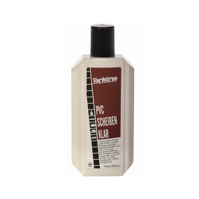 PVC Scheiben Klar von Yachticon ist in einer 250 ml Flasche erhältlich. Bei flexiblen Scheiben aus PVC und ähnlichen Material entfernt es matte Stellen, Verfärbungen und Kratzer.