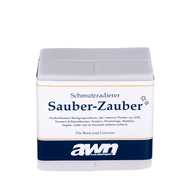 Der awn Sauber Zauber ist ein hochwirksamer Reinigungsradierer, der intensive Flecken von GFK, Fenstern, Schlauchbooten, Fendern, Persennings, Metallen, Segeln, Leder und vielen anderen Untergründen mühelos entfernt.