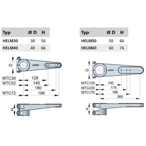 Diese Ruderarme sind für Ruderwellen mit Ø 30, 40, 50 oder 60 mm Durchmesser lieferbar. Die Verbindung mit einer Ø 30 oder Ø 40 mm Ruderwelle geschieht mit Hilfe von 2 Klemmbolzen und Schrauben, die serienmäßig mitgeliefert werden. Die Ø 30 oder 40 mm Ruderarme sind mit 4 Befestigungspunkten für den Steuerzylinder versehen, dadurch sind sie für eine Vielzahl verschiedener Hydrauliksteuerungen geeignet, z.B. für VETUS Hydraulikzylinder MTC30, MTC52 und MTC72. Die Ø 50 und 60 mm Arme werden mit Hilfe von 2 Klemmbolzen und einem Edelstahlkeil festgesetzt, die ebenfalls mitgeliefert werden. Die Ø 50 oder 60 mm Arme haben 3 Befestigungspunkte und sind somit unter anderem geeignet für die VETUS Zylinder MTC125, MTC175 und MT230. Für die Verbindung dieser Ruderarme mit VETUS Hydraulikzylindern MTC30 bis einschließlich MTC175, sind passende Bolzensätze als Zubehör lieferbar.
