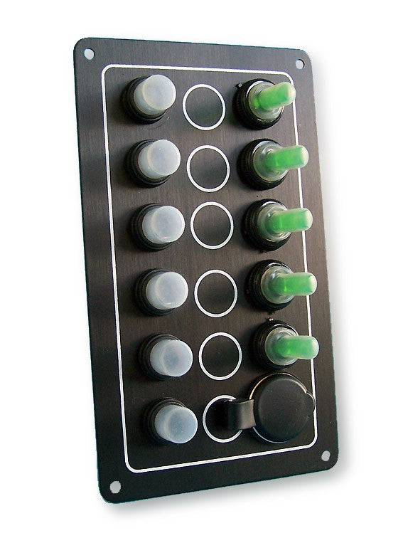 Schaltpaneel wasserdicht 4 Schalter mit LEDs 1 Taster Steckdose robustes Aluminiumpaneel mattschwarz anodisiert 171x101 mm LED-Schalter Spannungsversorgung für Boote
