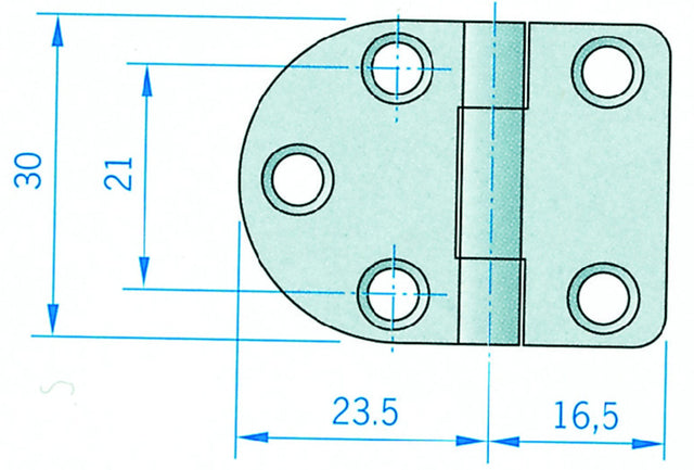 Scharnier von der Marke Roca aus rostfreiem Niro. Gelenk unten und verdeckt, Maße: 30x40 mm, Materialstärke: 1,5 mm.