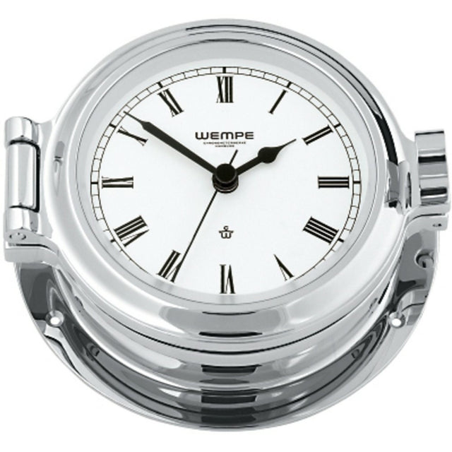 Die WEMPE Nautik Schiffsuhr ist eine Bullaugen-Schiffsuhr mit Quarz-Batteriewerk. Das Gehäuse ist aus massivem Messing verchromt mit einem Knebelverschluss, wodurch sowohl ein Batteriewechsel und auch eine Nachjustierung der Instrumente problemlos vorgenommen werden kann.