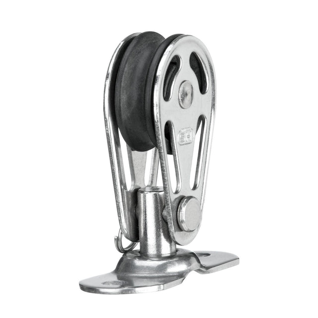 Gleitlager-Block für 6 mm Tauwerk mit Edelstahl-Seitenteilen. Montiert auf eine Grundplatte mit Bolzen, und dadurch sowohl kippbar als auch um 360° drehbar. Der Bügel ist demontierbar - es muss nur der mit einem Splentring versehene Bolzen entfernt werden. Die Seilrolle ist aus UV-beständigem, glasfaserverstärktem Kunststoff. Keine scharfen Grate am Nietkopf dank Taumelvernietung. Made in Germany. In Iserlohn, Nordrhein-Westfalen hergestellt.