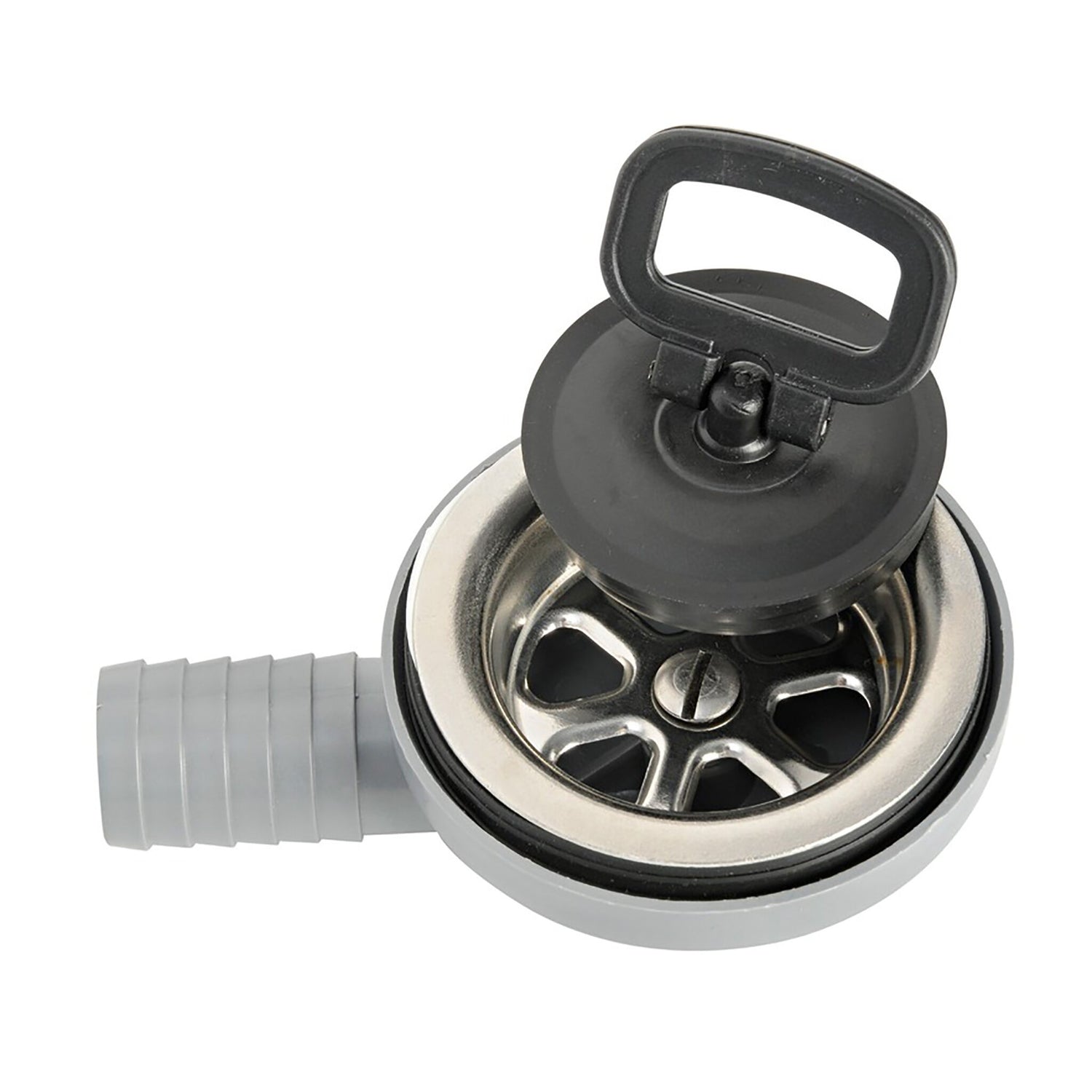 Ablaufgarnitur mit Sieb aus Edelstahl und Stöpsel. Schlauch-Innen-Durchmesser: 25 mm. Sieb-Durchmesser: 70 mm.