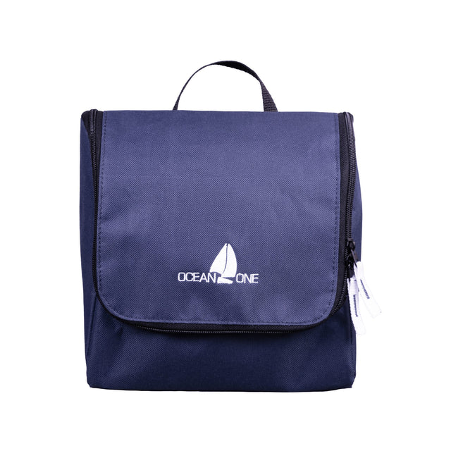 Praktische Kulturtasche zum Aufhängen von OCEAN ONE in navy mit weißen Nähten, die sich farblich absetzen. Das Material ist aus 100% Polyester, wasserdicht, abwaschbar und somit sehr pflegeleicht. Mit abnehmbarem Spiegel und mehreren Innenfächern, die unterschiedlich groß sind.