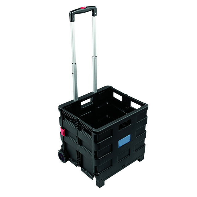 Problemlos trägt dieser Faltbox Trolley Lasten bis zu einem Gewicht von 25 kg. Durch seine Leichtlaufrollen und durch seinen bis zu 80 cm ausziehbaren Teleskopgriff aus rostfreiem Aluminium ist der Trolley leicht zu händeln. Mit seinem geringen Packmaß von nur 38 x 36 x 8 cm lässt er sich super verstauen. Perfekt für Boot und Caravan. Innenmaß Box: 35 x 32 x 28 cm. Farbe: Schwarz.