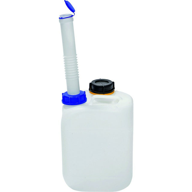 Wasserkanister aus Polyethylen. Mit Tragegriff, Auslass, Auslaufrohr und unverlierbarem Schraubverschluss. Erhältlich in 3 verschiedenen Größen auf das Volumen bezogen: