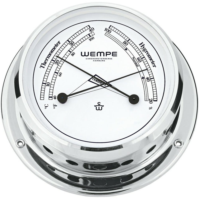 Das WEMPE Skiff Comfortmeter ist eine Bullaugen-Schiffsuhr mit Quarzuhr-Batteriewerk. Das Uhrengehäuse ist aus massivem und verchromtem Messing, poliert und hat einen Knebelverschluss, was den Batteriewechsel erleichtert. Eine Nachjustierung der Instrumente ist somit auch möglich. Das Zifferblatt ist weiß mit arabischer Skala.