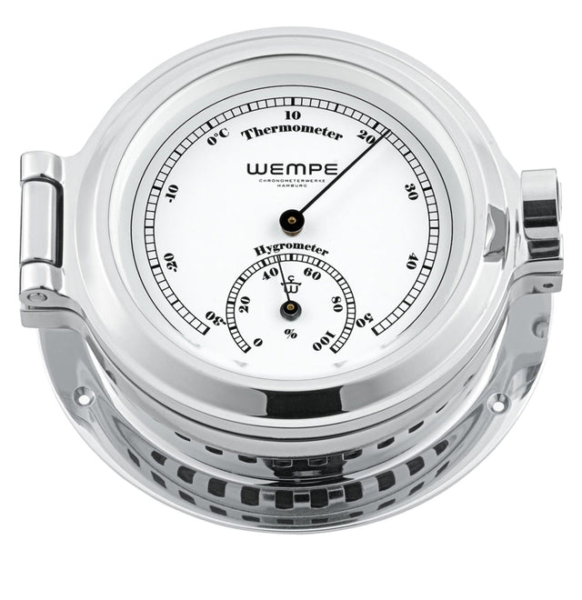 WEMPE Thermometer und Hygrometer Bullaugen-Schiffsuhr, Kombiinstrument aus verchromtem Messing, Quarz-Batteriewerk