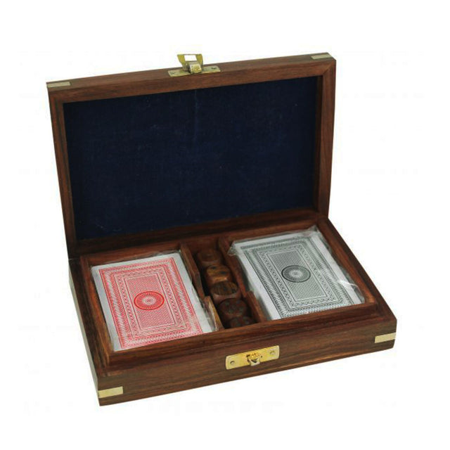 Karten- und Würfelbox Holz massiv, Spieleset ideal für Unterwegs, Doppeltes Kartenspiel inklusive